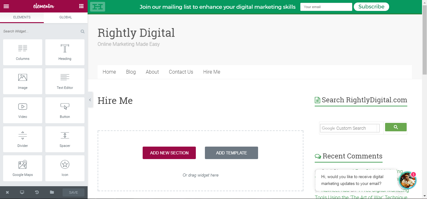 For the purpose of this tutorial, I will show you how I created the ‘Hire Me’ page for Rightly Digital using the Elementor plugin.