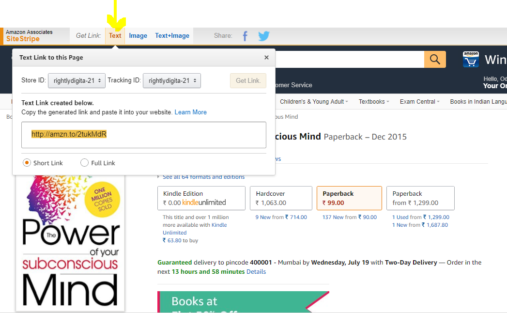 Then go to the product page on Amazon and click on the ‘Get Link’ option on the top left-hand corner. You can then choose the text version of the link that’s your affiliate link.